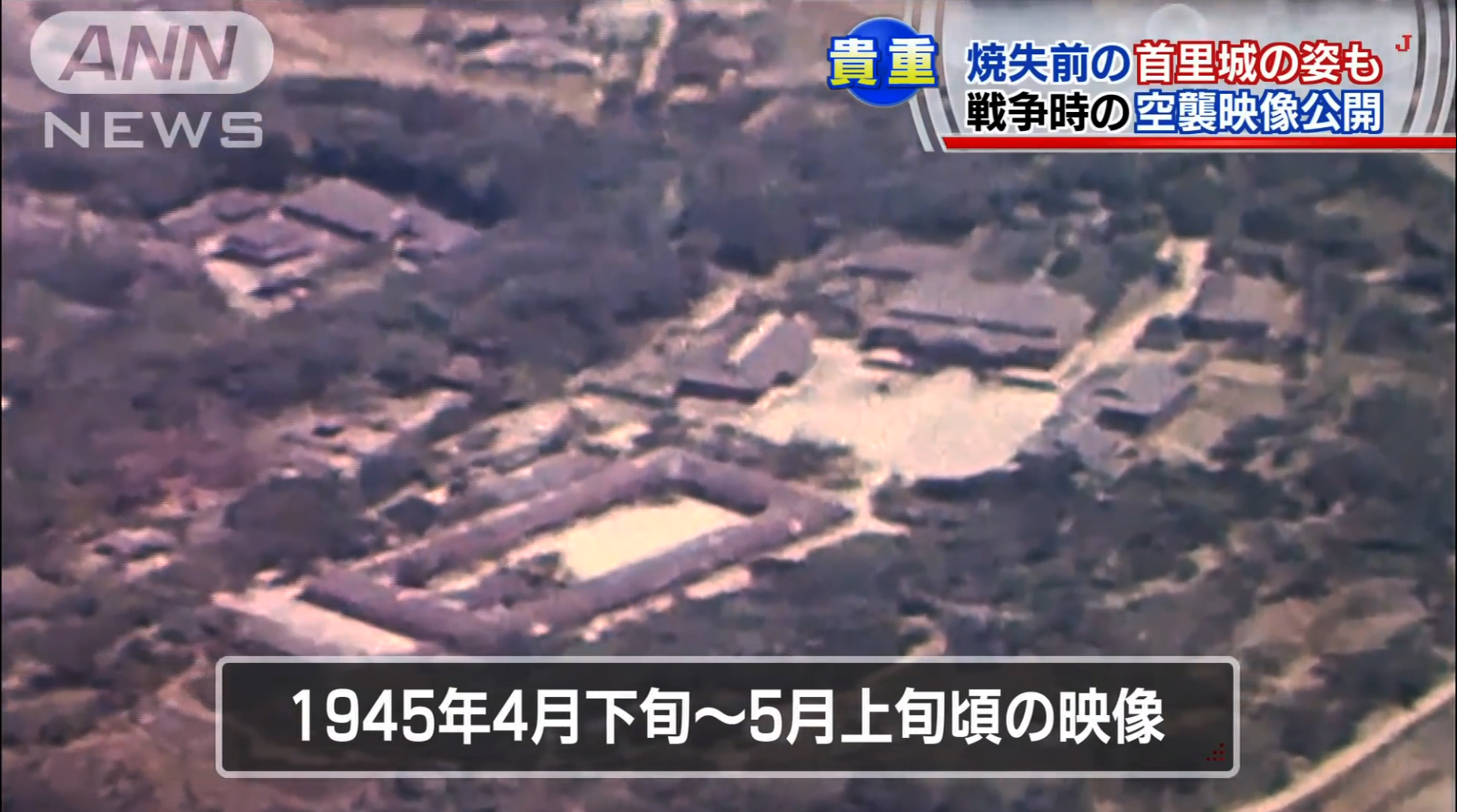 A film clip shot by a U.S. military reconnaissance aircraft during a bombing and strafing run in the Battle of Okinawa in mid-April 1945 was shown in a recent ANN newscast. The image above was captured from the newscast. Yusuke Oda, from Oita, said, “This might be the first images of Shuri Castle found in color.” These are the last images of Shuri Castle before it was destroyed. The castle we see today is a reconstruction. The clip will be shown to the public on May 10 at the 10th Aviation Corps Peace Walk in Oita Prefecture. (Source: “Color film of Shuri Castle during the war surfaces,” Japan Update: Okinawa News and More, 4/22/14)