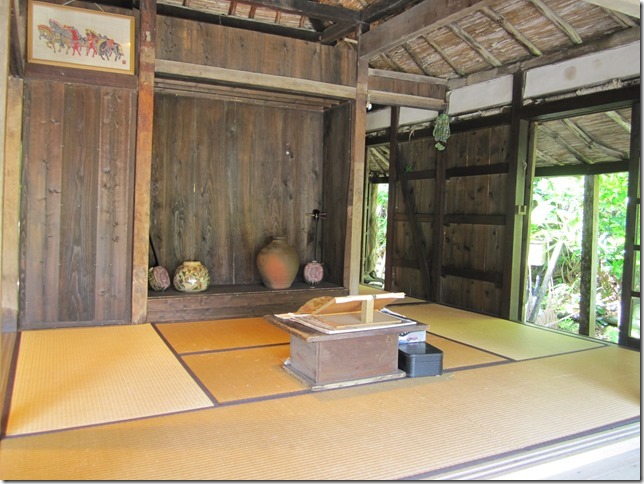 Below is a picture I took of the Ooshiro house. Note that the posts holding up the roof aren’t straight. Why? I think because large timber, which you could shape into straight poles, was hard to come by in Okinawa. Because of the many typhoons that pass over Okinawa every year, most trees can’t grow big over much of the island. The ones that do are in the northern part of the island where it’s mountainous.