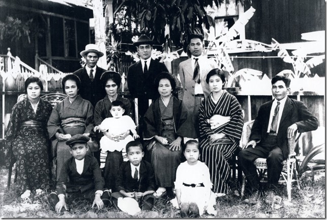 The photograph below of the Inafuku and Arashiro families with Mrs. Wakukawa (sitting second from left, Seiyei Wakukawa’s mother) was taken, I believe, in Honolulu in 1921 before my grandmother (fourth from left), my dad, Ronald (middle, sitting on ground), and my Aunty Annie (young girl sitting on ground) left Hawaii to bring the remains of my grandfather, Hoyei Inafuku, back to Haneji, Okinawa. Grandfather Hoyei passed away from influenza in Waimea, Kauai, in August 1918.