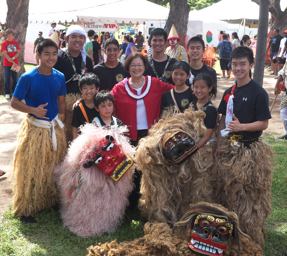 The shishimai were followed by a paranku troupe. The lady in the red jacket with an orchid lei is U.S. Senator Mazie Hirono. See her photo, below, with the shishimai performers.