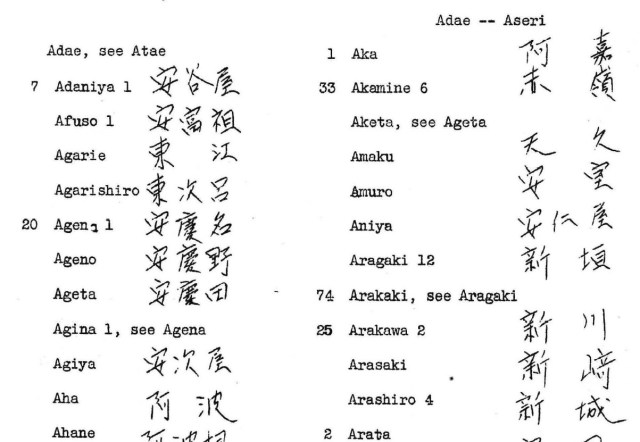 The basis of this list is from the Nippu Jiji Nekan, Honolulu, 1941, and contains the names and Japanese characters of all persons in this Directory who trace their ancestry back to the Okinawan Islands. Before each name is the number of adults listed who have this appelative. On this list from the Nippu Jiji are also indicated those with the same last names who were inducted into the U.S. Army in Honolulu in March, 1943. The numbers following the names refer to these A.J.A. voltmteers.