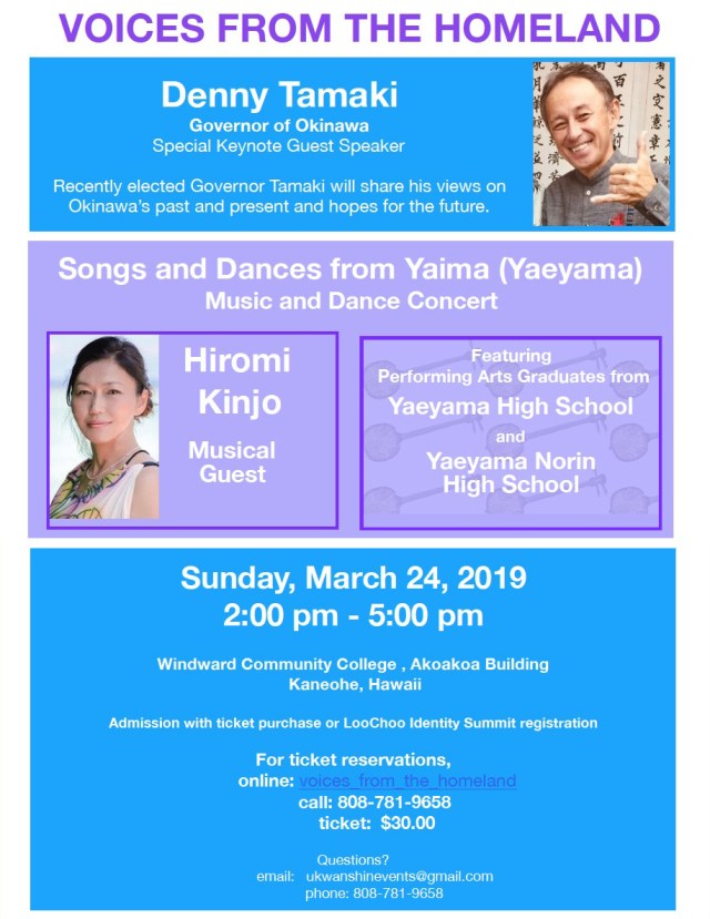 This is a great opportunity for Governor Tamaki to “talk story” and interact with community members, especially those involved in Ryukyuan language and culture revitalization as well as environmental protection and conservation. The Governor has expressed an interest in engaging with Hawai`i’s diverse community that may include other indigenous groups, academia, tourism representatives, and all who recognize the ongoing concerns that challenge our people. We invite everyone to join us for an evening of discussion with this amazing and courageous “LooChoo Nu Kwa” (child of LooChoo), whose fight for democracy for Okinawa has brought him great respect for Shimanchu on an international scale.